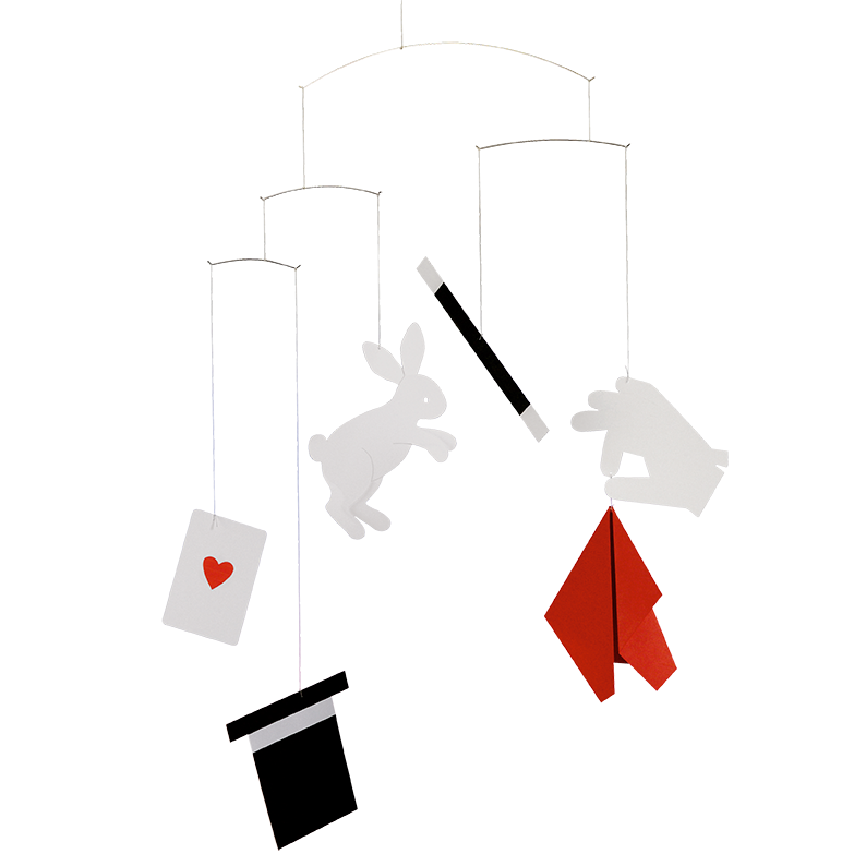 The Flensted Hocus Pocus Black Red White Mobile, designed by Louise B. Helmersen in 2005, is a captivating and whimsical piece that brings the enchantment of magic to your space. Featuring six symbols of magic in striking black, red, and white colors, this mobile is crafted from high-quality cardboard and designed to add a touch of mystery and charm.