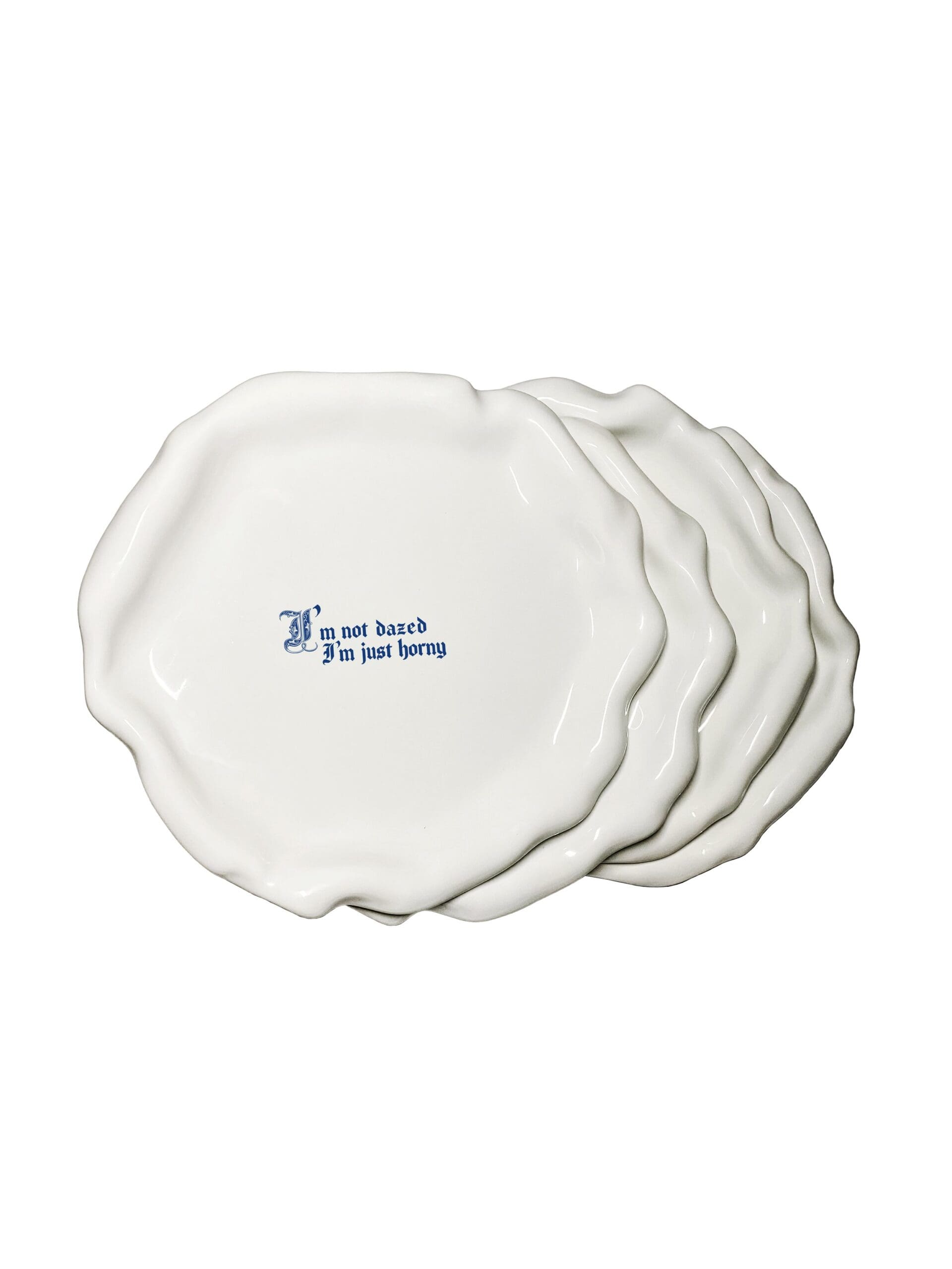 Measuring 28 cm in diameter and 3.4 cm in height, this dinner plate is perfect for serving your favorite meals. The phrase “I’m Not Dazed I’m Just Horny” is prominently displayed in cobalt blue, applied using the photo-ceramic technique for a durable and vibrant decoration. These plates are designed to challenge traditional table etiquette, bringing humor and irony to your dining moments.