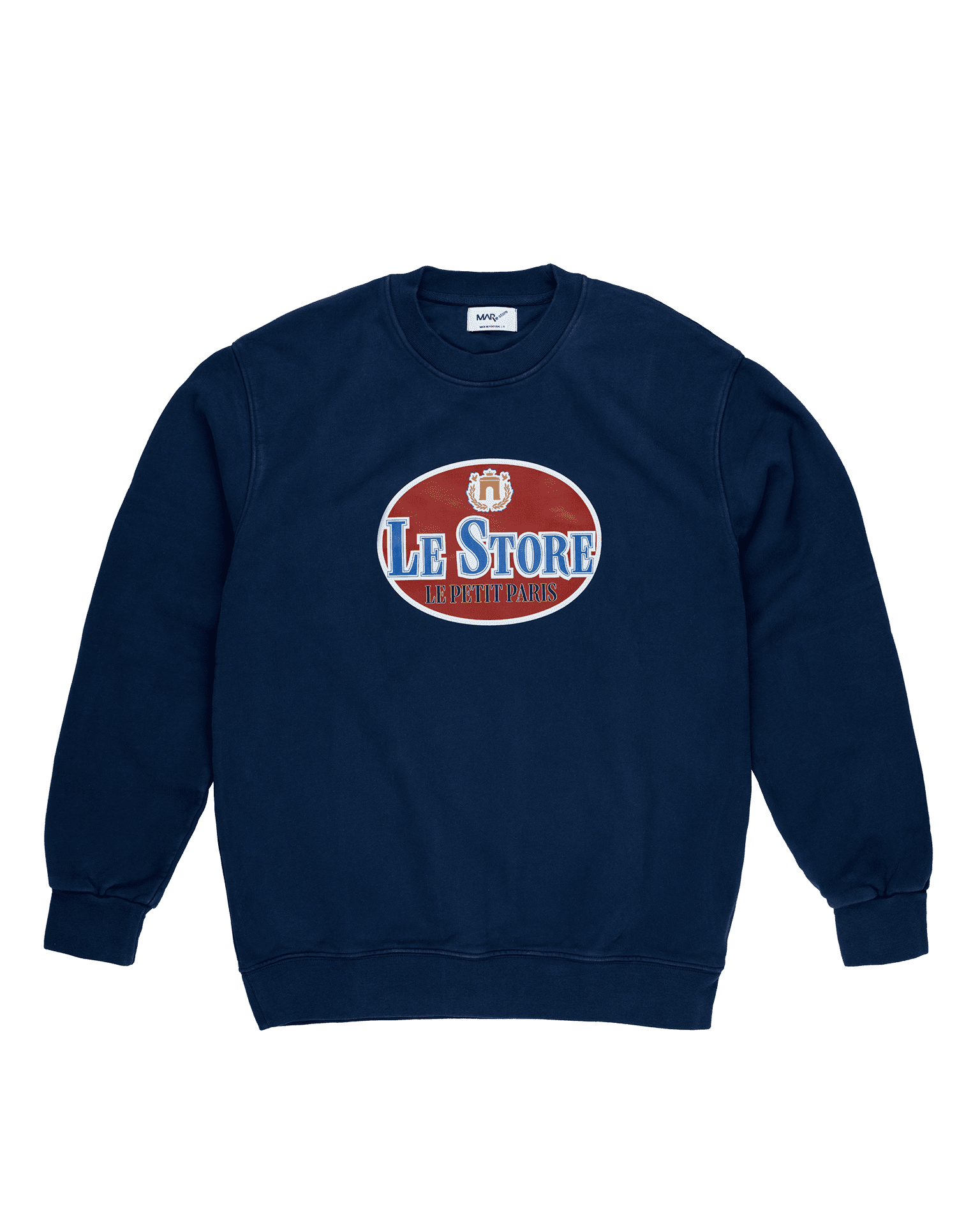Introduce the Hotel Le Petit Paris Navy Sweatshirt to your collection for a blend of classic style and modern comfort. This extra-large sweatshirt features the captivating “Le Store – Le Petit Paris” script, set off by a bold red backdrop, making a stylish statement against the navy base.