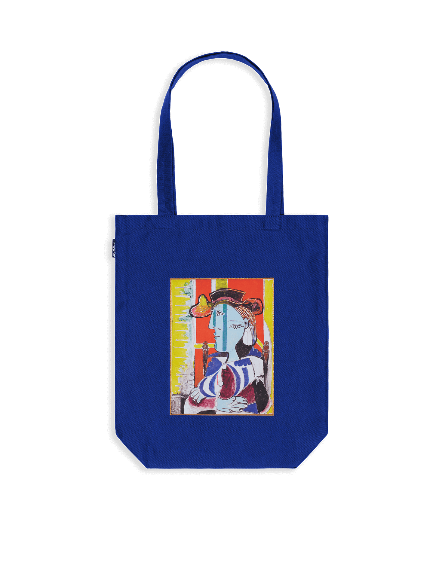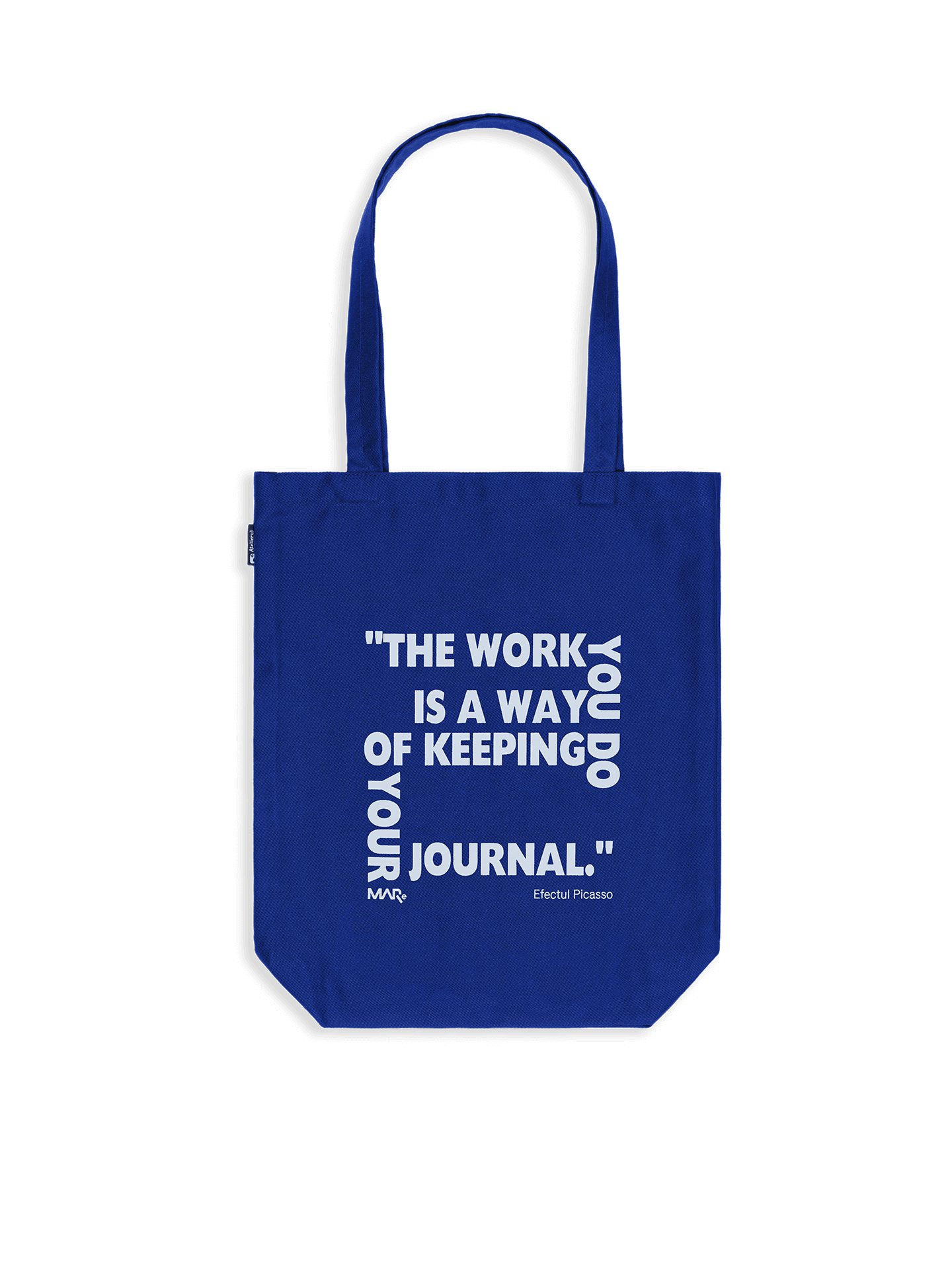 Blue tote bag with Picasso inspirational text